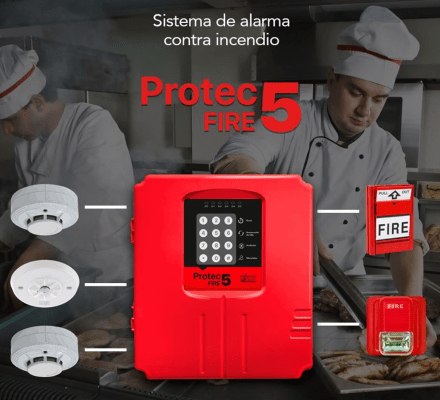 Es un panel de alarma de 5 zonas que admite hasta 10 dispositivos por zona, una amplia cantidad de detectores de humo y temperatura, así como estaciones manuales (que sirven para que puedas realizar la activación manualmente).