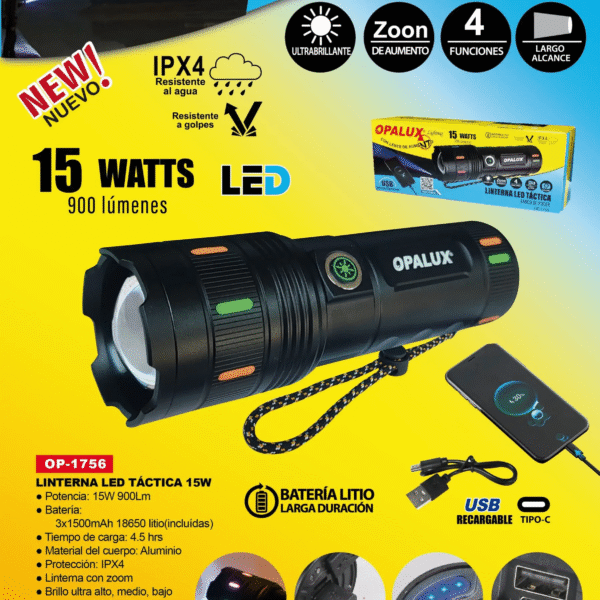 Linterna Led Táctica Recargable 15W Opalux OP-1756