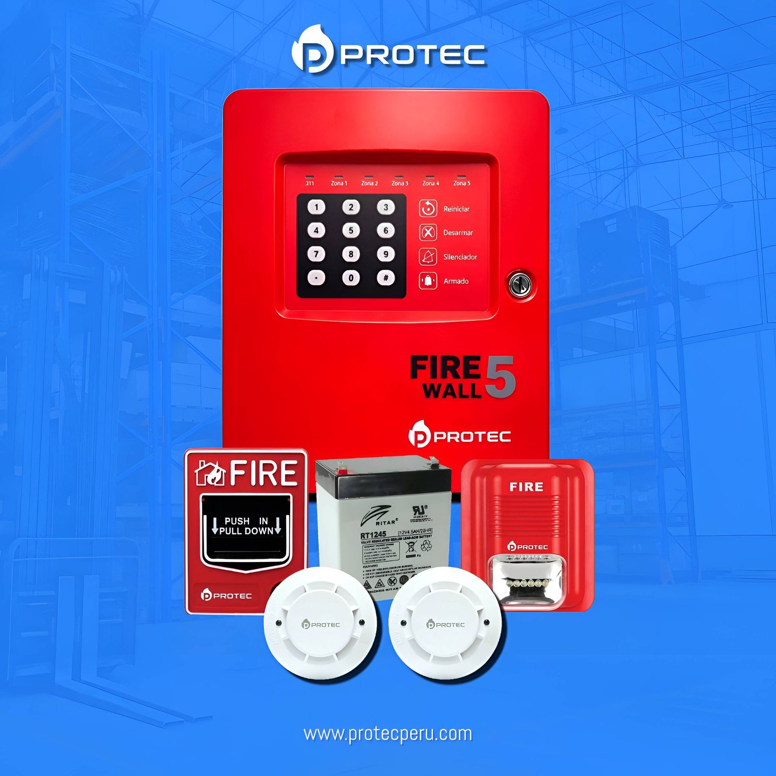 KIT CONTRA INCENDIO PROTEC FIREWELL 5 PANEL 5 ZONAS CON 2 DETECTORES DE HUMO, ESTACIÓN MANUAL Y SIRENA ESTROBOSCÓ PICA